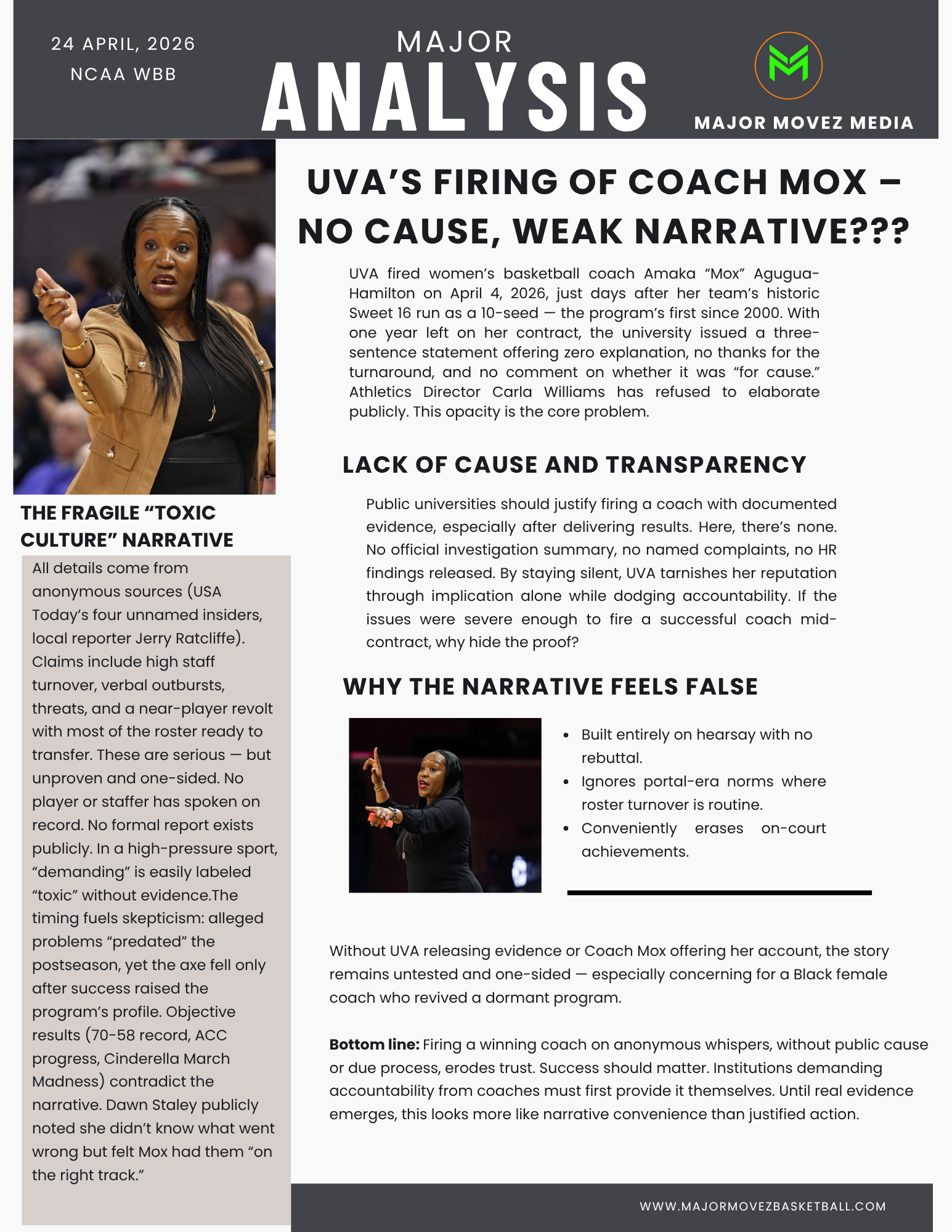 UVAβs decision to part ways with Coach Amaka βMoxβ Agugua-Hamilton raises serious questions β not just about the move, but the lack of transparency behind it.